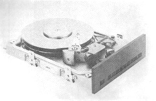A másik veszély, ha valami porszem bekerül az egyébként pormentes térbe. Ekkor ugyanis akár egyetlen porszem is, beakadva a fejek és a lemez felülete közé, képes az egész lemezfelületet tönkretenni. Ezt érzékelteti az előző ábrának az író/olvasó fejet ábrázoló részlete megismételve, amelyen (kis túlzással) egy méretarányos porszem is szerepel. El lehet képzelni, mi történik, ha abba a fej és a lemezfelület közti kis résbe egy ekkora ,,szikla'' beszorul. Éppen ezért ne legyünk kíváncsiak arra, hogy hogyan néz ki belülről a gépünk merevlemeze, mivel a szétbontása annak visszavonhatatlan tönkretételét jelenti! Elégedjünk meg inkább a képen látható, régi merevlemezes tárral egy régebbi könyvből...