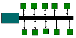 A kiszolgálóhoz egy busz, vagy sín kapcsolódik (vastag
